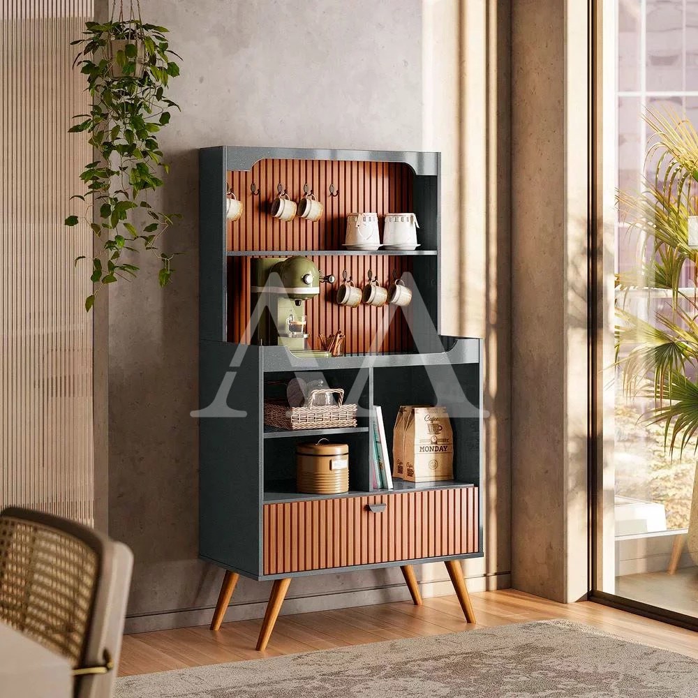 O Cantinho do café nos conecta ao passado através de seu toque retrô, junto aos detalhes ripados que garantem um ar despojado ao ambiente. Pés de madeira: sim Porta basculante: sim Ganchos de ferro: sim Molduras em MDF com detalhe usinado: sim Dimensões Altura: 150 cm Largura: 79,5 cm Profundidade: 41 cm Garantia: 03 meses