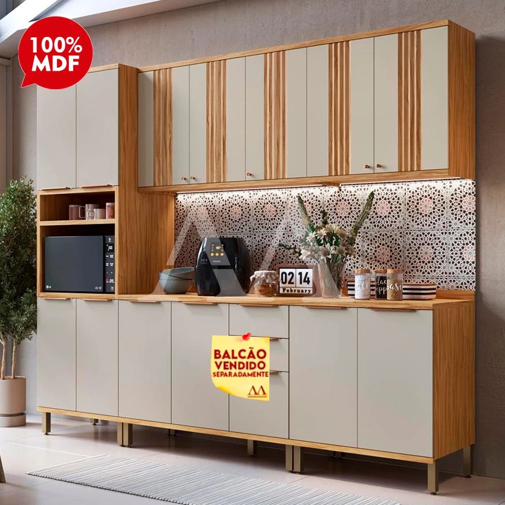 A cozinha Sauvignon da Ronipa vai deixar sua cozinha super charmosa e moderna. Material Principal: 100 % MDF Portas caneladas: sim Corrediças telescópicas: sim Pés com ABS> sim Pistão a gás: sim Dimensões Altura: 225 cm Largura: 270 cm Profundidade: 50,5 cm Garantia: 03 meses