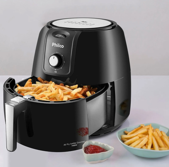 Fritadeira Air Fryer Philco Gourmet PFR13P agora é Jumbo e tem capacidade total para 8,1 litros. Toda tecnologia da Air Fryer proporcionando mais praticidade na cozinha. Ela possui função Timer de 60 minutos, controle de temperatura com ajuste de 80 a 200°C e base antiderrapante. O cesto é antiaderente e removível, garantindo que os alimentos não grudem e facilitando a limpeza. Com a Fritadeira Air Fryer Philco Gourmet PFR13P você tem alimentos muito mais saudáveis, afinal, você pode prepará-los sem ou com pouquíssimo óleo. Eles ficam macios por dentro e crocantes por fora.