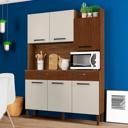 Kit's Modena irá se tornar o charme de sua cozinha, seu design diferenciado dispõe de um nicho para decoração superior podendo ser utilizado para vasos, flores e outros. Tem a sua disposição de um grande espaço para Eletrodomésticos podendo acomodar um micro-ondas, sua matéria prima valoriza o meio ambiente sendo feita de madeira de reflorestamento. Com acabamento fosco e textura sensível ao toque nos padrões Savana/White e Nogal/White.