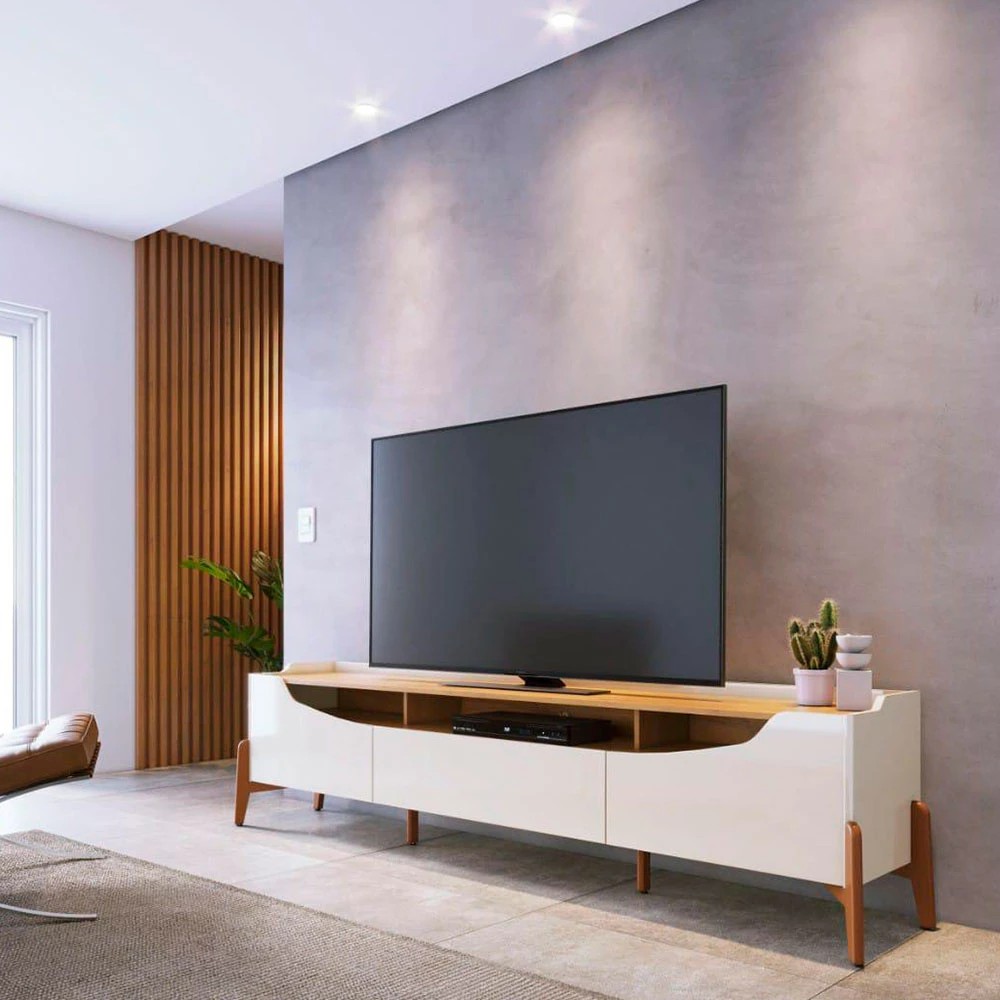 Com o Rack Bancada Para Sala Studio 2.2 Off White Nature - Imcal sua sala de estar ganha mais organização e um visual moderno e sofisticado. Material Principal: MDP/MDF de 15 mm com pintura Off White Nature e acabamento em UV fosco brilho Portas: 2 portas para guardar acessórios e manter o ambiente organizado Nichos: 3 nichos amplos para equipamentos eletrônicos e objetos decorativos Gaveta: 1 gaveta com corrediças telescópicas para abertura suave Pés: Pés em madeira maciça com sapata central regulável para estabilidade e estilo Dimensões: Altura: 55,6 cm Largura: 220 cm Profundidade: 40 cm Garantia: 03 meses.