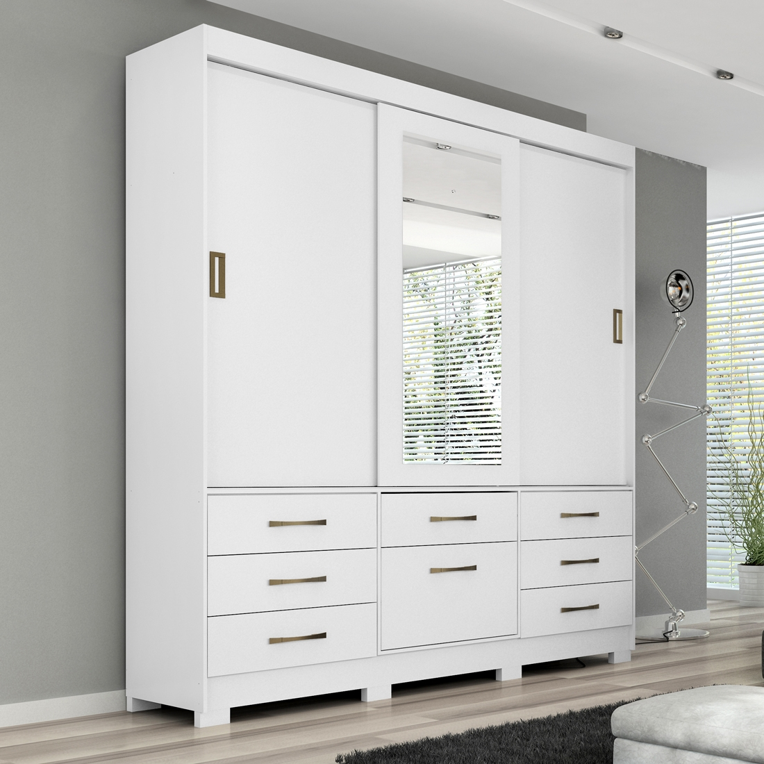 O Roupeiro Luiza tem a praticidade das gavetas externas e a distribuição de espaço interno que facilita sua organização. O espelho na porta central é um aliado importante trazendo praticidade no seu dia a dia e sensação de amplitude de espaço e elegância. Além das três portas de correr possui também uma porta basculante na parte inferior que pode ser utilizada como sapateira.